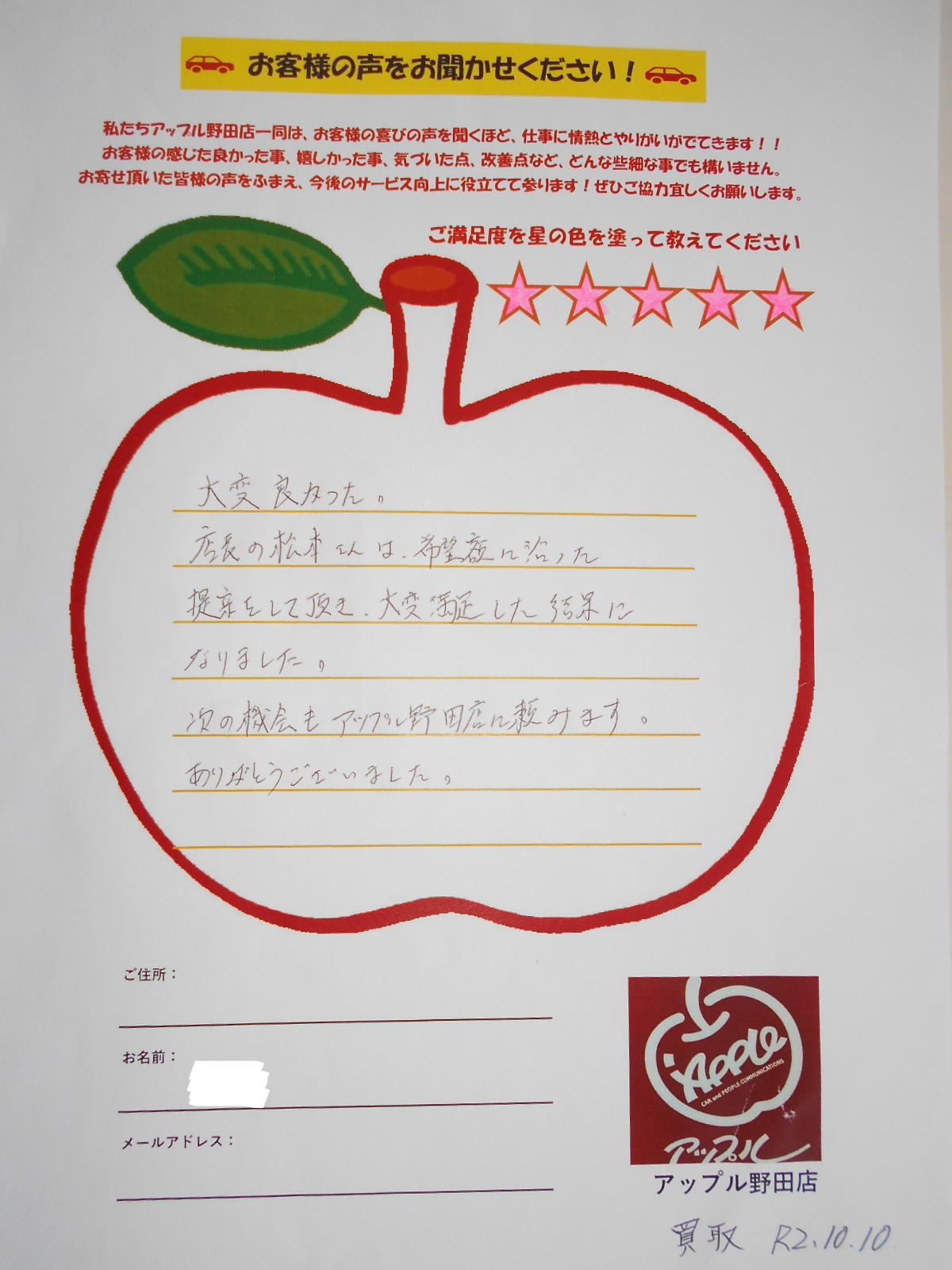 お車のご相談・ 査定だけでもOK! カンタン 入力 30秒 アップルがブランド買取始めました! お電話でも受付中! 受付時間10:00~19:00 04-7128-7217 お車のご相談・ 査定だけでもOK! カンタン 入力 30秒 アップルがブランド買取始めました! お電話でも受付中! 受付時間10:00~19:00 04-7128-7217 アップルがブランド買取始めました! お電話でも受付中! 受付時間10:00~19:00 04-7128-7217 店舗情報 在庫車 スタッフ紹介 ブログ お客様の声 キャンペーン お得 無料査定 click お客様の声 ご記入日: 2020/10/10 千葉県野田市 買取 J様 車名:スズキ ハスラー 大変良かった。店長の松本さんは希望額に沿った提案をして頂き、大変満足した結果になりました。次の機会もアップル野田店に頼みます。ありがとうございました。(お車2台売却頂きました) 前へ 次へ お客様の声一覧を見る