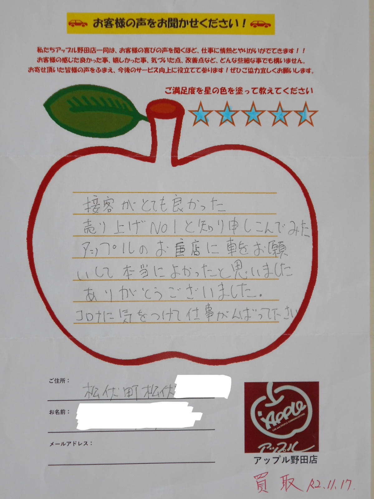 お車のご相談・ 査定だけでもOK! カンタン 入力 30秒 アップルがブランド買取始めました! お電話でも受付中! 受付時間10:00~19:00 04-7128-7217 お車のご相談・ 査定だけでもOK! カンタン 入力 30秒 アップルがブランド買取始めました! お電話でも受付中! 受付時間10:00~19:00 04-7128-7217 アップルがブランド買取始めました! お電話でも受付中! 受付時間10:00~19:00 04-7128-7217 店舗情報 在庫車 スタッフ紹介 ブログ お客様の声 キャンペーン お得 無料査定 click お客様の声 ご記入日: 2020/11/17 埼玉県松伏町松伏 買取 K・K様 車名:トヨタ プリウス(2023年3月~のPHVを含む) 接客がとても良かった。売り上げNo,1と知り申しこんでみた。アップルのお店に車をお願いして本当によかったと思いました。ありがとうございました。コロナに気をつけて仕事がんばってください。 前へ 次へ お客様の声一覧を見る