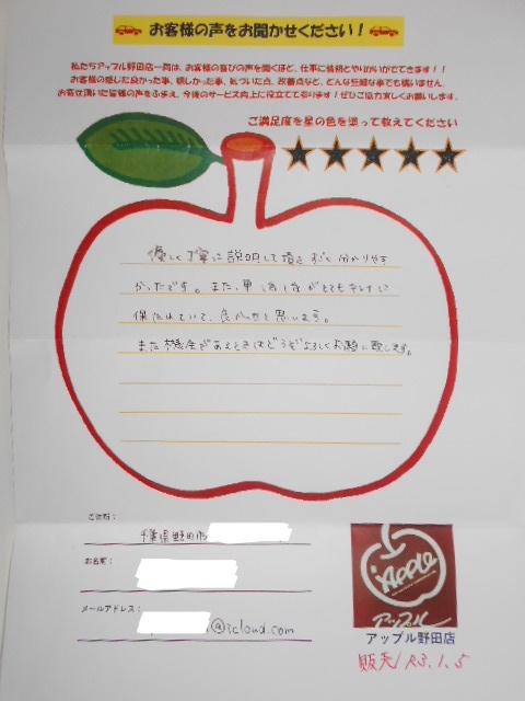 お車のご相談・ 査定だけでもOK! カンタン 入力 30秒 アップルがブランド買取始めました! お電話でも受付中! 受付時間10:00~19:00 04-7128-7217 お車のご相談・ 査定だけでもOK! カンタン 入力 30秒 アップルがブランド買取始めました! お電話でも受付中! 受付時間10:00~19:00 04-7128-7217 アップルがブランド買取始めました! お電話でも受付中! 受付時間10:00~19:00 04-7128-7217 店舗情報 在庫車 スタッフ紹介 ブログ お客様の声 キャンペーン お得 無料査定 click お客様の声 ご記入日: 2021/01/05 千葉県野田市 販売 K・M様 車名:ホンダ N-BOX 優しく丁寧に説明して頂きすごくわかりやすかったです。また車1台1台がとてもキレイに保たれていて良かったと思います。また機会があるときにはどうぞよろしくお願い致します。 前へ 次へ お客様の声一覧を見る