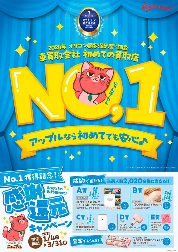 『 2024年 オリコン顧客満足度®調査 車買取会社 初めての買取店 NO.1 獲得記念!感謝還元キャンペーン 』