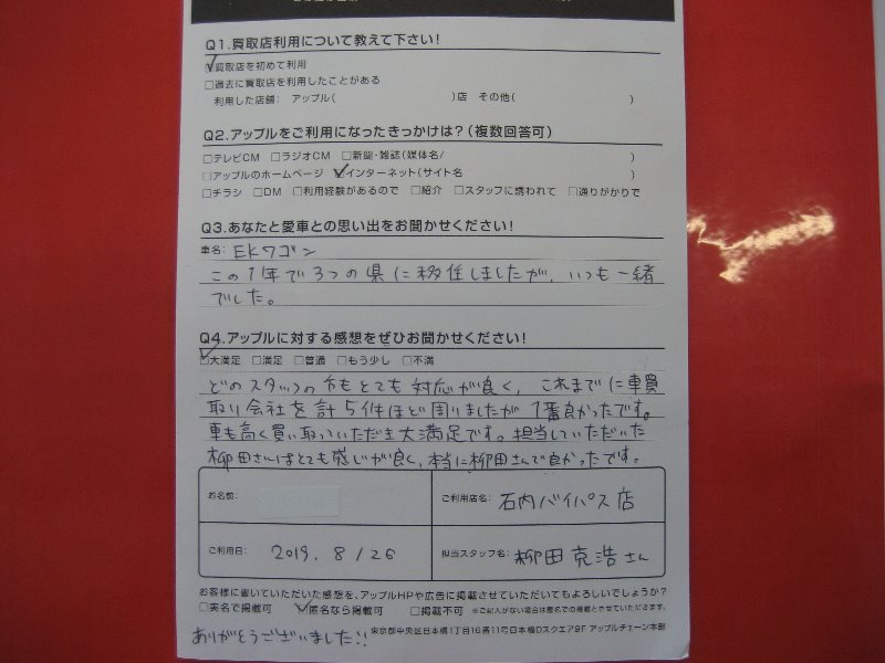 お車のご相談・ 査定だけでもOK! カンタン 入力 30秒 アップルがブランド買取始めました! お電話でも受付中! 受付時間9:00~18:00 トラブル防止の為電話査定はお断りしております。 0120-685-900 お車のご相談・ 査定だけでもOK! カンタン 入力 30秒 アップルがブランド買取始めました! お電話でも受付中! 受付時間9:00~18:00 トラブル防止の為電話査定はお断りしております。 0120-685-900 アップルがブランド買取始めました! お電話でも受付中! 受付時間9:00~18:00 トラブル防止の為電話査定はお断りしております。 0120-685-900 店舗情報 在庫車 スタッフ紹介 ブログ お客様の声 キャンペーン 無料査定 click 最新記事一覧 月別アーカイブ 2021年11月(1)2021年10月(1)2021年09月(1)2021年08月(1)2021年07月(1)2021年06月(1)2021年04月(1)2021年03月(1)2021年02月(1)2021年01月(2)2020年12月(1)2020年11月(2)2020年10月(1)2020年09月(1)2020年08月(1)2020年07月(1)2020年06月(1)2020年05月(2)2020年04月(3)2020年03月(1)2020年02月(1)2020年01月(1)2019年12月(1)2019年10月(3)2019年09月(1)2019年08月(2)2019年07月(1)2019年06月(1)2019年04月(1)2019年03月(1)2019年02月(1)2019年01月(2)2018年12月(2)2018年11月(1)2018年10月(1)2018年09月(1)2018年07月(2)2018年06月(1)2018年05月(1)2018年04月(2)2018年03月(1)2018年02月(1)2018年01月(3)2017年12月(1)2017年11月(1)2017年10月(1)2017年09月(1)2017年08月(1)2017年04月(1)2017年03月(1)2017年02月(1)2016年12月(1)2016年09月(1)2016年08月(2)2016年07月(2)2016年05月(1)2016年04月(1)2016年01月(2)2015年12月(2) 21-30/77件中 [ つぶやき ] 2020/05/16(土) 08:53 営業時間変更のお知らせ アップル石内バイパス店のブログをご覧いただき、ありがとうございます!本日より、アップル石内バイパス店の営業時間が変わります!営業時間9:00~18:30(査定の最終受付時間18:30)です!定休日はございません!お車の査定は無料です!是非お気軽にお問い合わせ、ご来店ください!店内は、新型コロ… [ 未分類 ] 2020/04/27(月) 14:24 新型コロナウイルス感染症予防対策について アップル石内バイパス店のブログをご覧いただき、ありがとうございます!アップル石内バイパス店では、新型コロナウイルス感染症予防対策として、以下の項目について徹底しており、感染症予防対策に取り組んでいます。①スタッフ全員、マスクを着用しての接客②手洗いの徹底③定期的に店内の空気入れ替えのための換… [ 未分類 ] 2020/04/18(土) 09:18 GW休業のお知らせ アップル石内バイパス店のブログをご覧いただき、ありがとうございます!GW休業のお知らせです。5月1日(金)から5月6日(水)まで、GW休業致します。5月7日(木)10時より、営業致します。どうぞ宜しくお願い致します。★お車の買取はもちろん、販売・オイル交換やタイヤ交換など広島市内のお車のこと… [ 未分類 ] 2020/04/01(水) 15:56 4月です アップル石内バイパス店のブログをご覧いただき、ありがとうございます!今年は、大雪が降ることなく春をむかえてしまいましたね。スタッドレスタイヤに替えて準備万端だったのに…!…と、去年も同じこと言ったような気がします(笑)暖冬なのはいいことなのだろうか…(;'∀')かと思えば… [ 未分類 ] 2020/03/01(日) 09:28 新春キャンペーンは今月いっぱいまで! アップル石内バイパス店のブログをご覧いただき、ありがとうございます!1月から始まりました新春キャンペーンは、今月いっぱいまで開催中です!!ご成約のお客様の中から、抽選で豪華賞品が当たるチャンスです!お車のご売却、買い替えをご検討のお客様!!この機会に是非、アップル石内バイパス店へご来店くださ… [ つぶやき ] 2020/02/01(土) 10:04 新春キャンペーン実施中 アップル石内バイパス店のブログをご覧いただき、ありがとうございます!先月から引き続き、今月も新春キャンペーン開催中です。ご成約のお客様の中から、抽選で豪華賞品が当たるチャンスです!お車のご売却、買い替えをご検討のみなさま!!この機会に是非、アップル石内バイパス店へご来店ください(^▽^)アッ… [ つぶやき ] 2020/01/06(月) 09:42 新春キャンペーンのお知らせ アップル石内バイパス店のブログをご覧いただき、ありがとうございます!新年あけましておめでとうございます。本年も、アップル石内バイパス店をどうぞ宜しくお願い致します!さて今年も始まりました「ありがとうキャンペーン」!!!キャンペーン期間中にご成約いただきましたお客様の中から、抽選で豪華賞品が当… [ 未分類 ] 2019/12/26(木) 13:52 年末年始休業のご案内 アップル石内バイパス店のブログをご覧いただき、ありがとうございます!年末年始休業のご連絡です。12月29日(日)から1月3日(金)まで、年末年始休業致します。1月4日(土)10時より、通常営業致します。どうぞ宜しくお願い致します。★お車の買取はもちろん、販売・オイル交換やタイヤ交換など広島市… [ つぶやき ] 2019/10/18(金) 16:23 ありがとうキャンペーン当選者発表! アップル石内バイパス店のブログをご覧いただき、ありがとうございます!8月から9月までに行われた「ありがとうキャンペーン」、ご契約いただいたお客様の中から抽選で素敵な商品が当たる!と