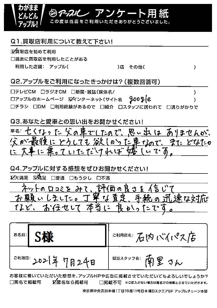 ネットの口コミをみて、評価の良さを信じてお願いしました。丁寧な査定、手続きの迅速な対応など、お任せして本当に良かったです。