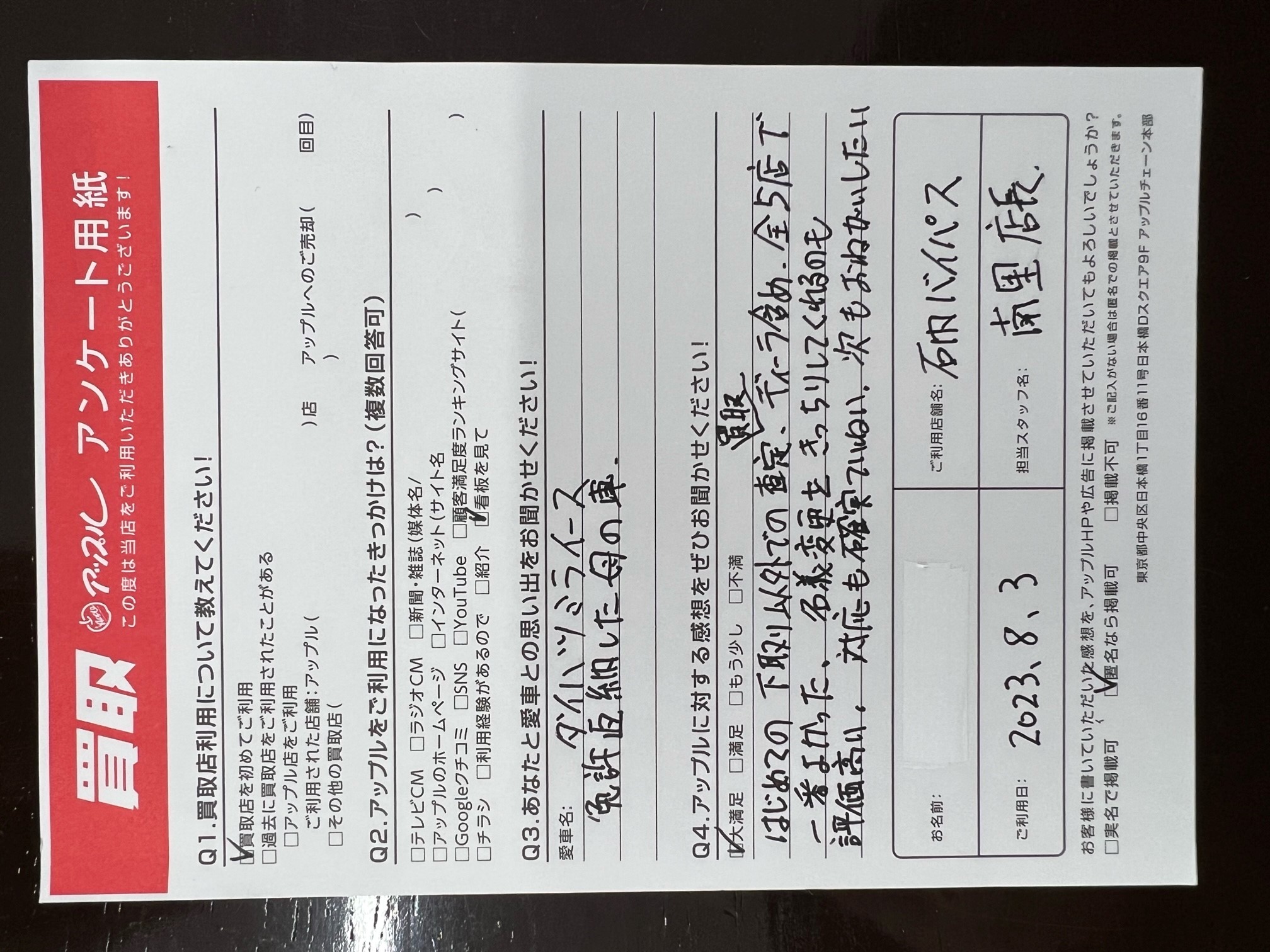 初めての下取り以外の買取査定、ディーラー含め全5社で1番よかった。名義変更をきっちりしてくれるのも評価高い。