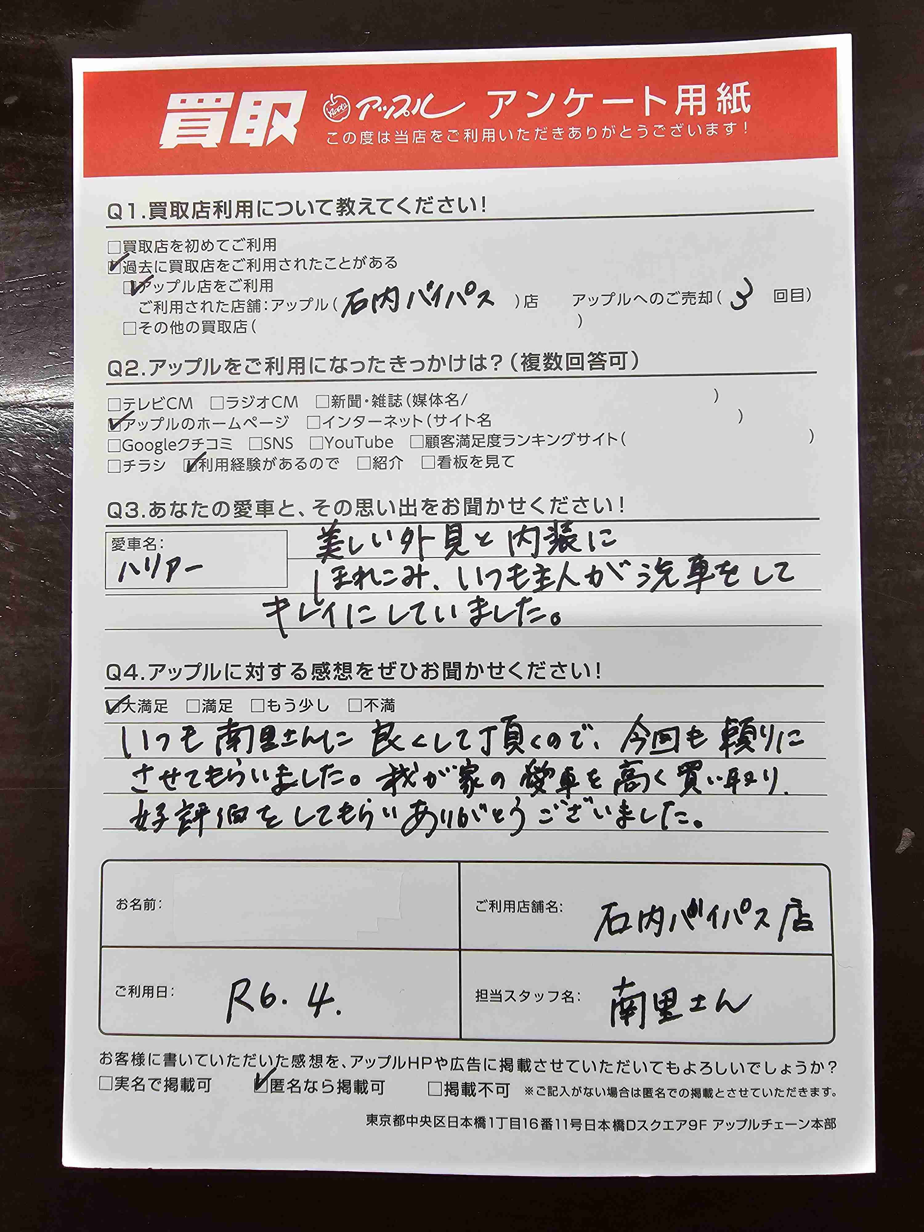 いつも南里さんに良くして頂くので、今回も頼りにさせてもらいました。我が家の愛車を高く買い取り高評価をしてもらいありがとうございました。