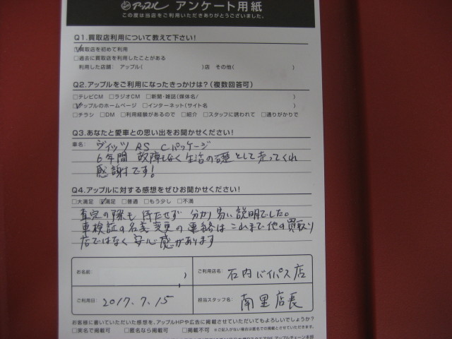 車検証の名義変更の連絡はこれまで他の買取り店ではなく安心感があります。