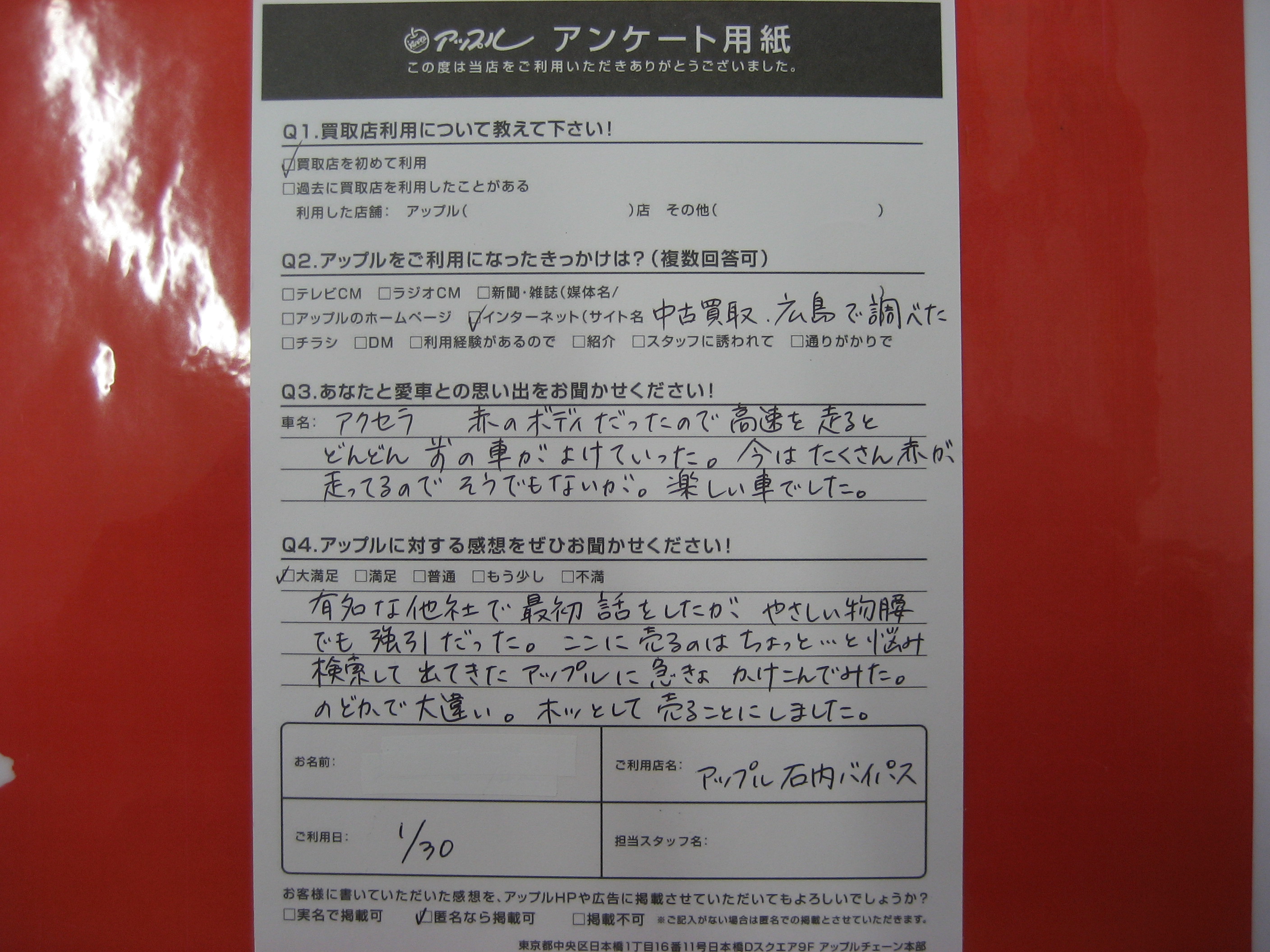 広島県広島市 I.K様 車名:マツダ アクセラスポーツ