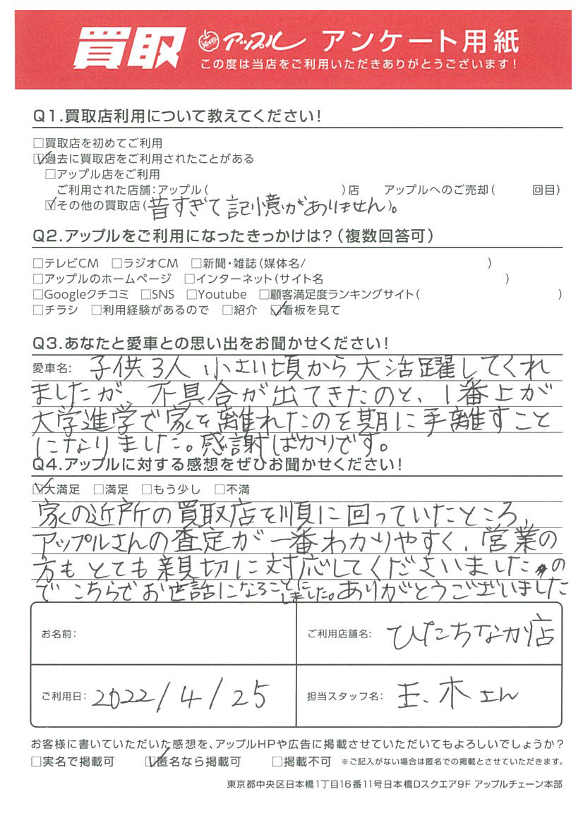 ☆大満足☆家の近所の買取店を順に回っていたところ、アップルさんの査定が一番わかりやすく、営業の方もとても親切に対応してくださいましたのでこちらでお世話になることにしました。ありがとうございました。
