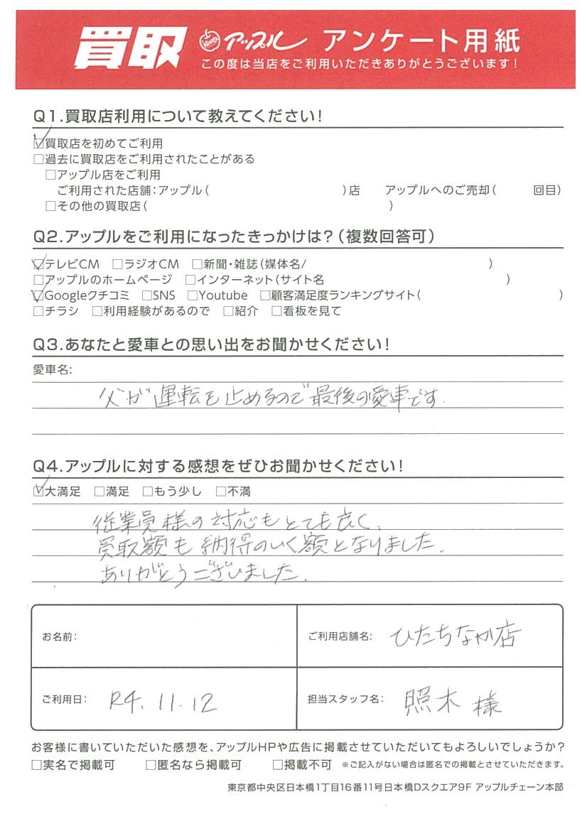 この度は、お父様の最後のお車ティーダをお任せ下さりありがとうございました。お父様が大事に扱われていたお車をご満足いただける形で買取させていただけてとても光栄です。また、商談の際は真摯に話を聞いてくださってありがたかったです。また機会ありましたらぜひ、よろしくお願いいたします。
