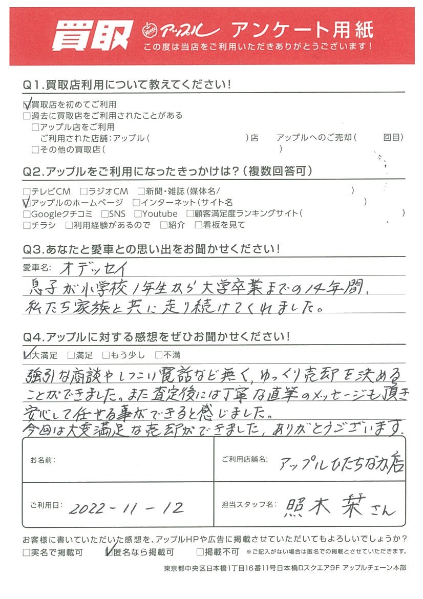 こちらこそ、この度はオデッセイをお任せ下さりありがとうございました。新車から長年大切に乗られてきた思い出のあるお車を買取させていただけてとても嬉しかったです。また、お褒めのお言葉をいただきありがとうございます。とても励みになりますし、これからもお客様のために全力で頑張ろうと感じています。またぜひ!よろしくお願いいたします。