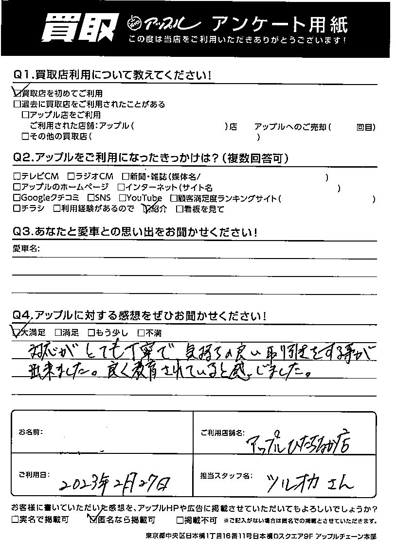 ☆大満足☆対応がとても丁寧で気持ちの良い取り引きをする事が出来ました。良く教育されていると感じました。