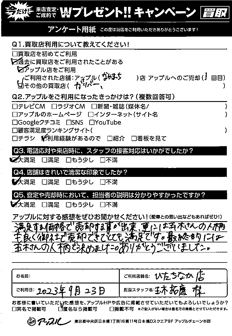 満足する価格で売却する事が出来、更には玉木さんの人柄も良く御社で売却できてとても満足です。最終的には玉木さんの人柄で決めました。ありがとうございました。