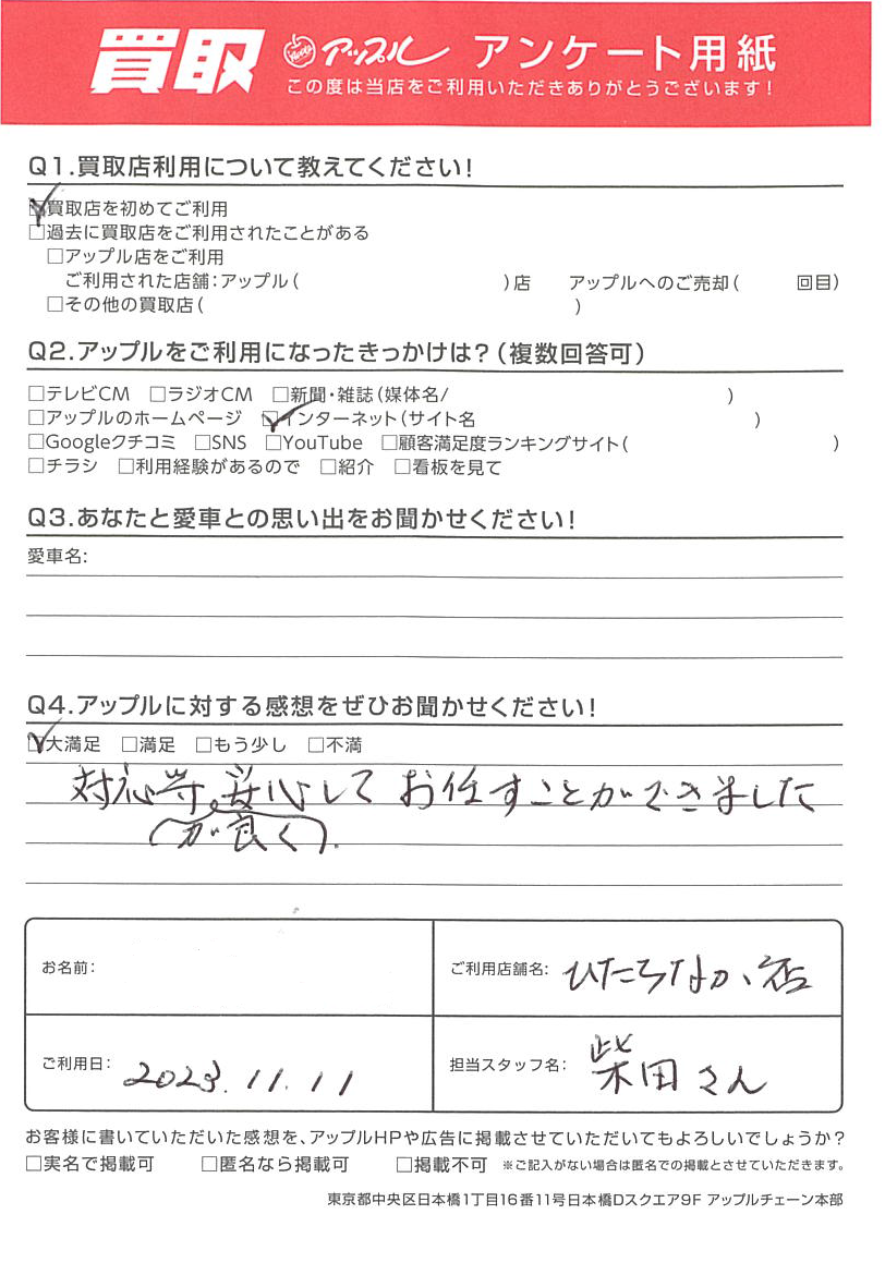 お車のご相談・ 査定だけでもOK! カンタン 入力 30秒 アップルがブランド買取始めました! お電話でも受付中! 受付時間 9:30~18:30 029-352-2311 お車のご相談・ 査定だけでもOK! カンタン 入力 30秒 アップルがブランド買取始めました! お電話でも受付中! 受付時間 9:30~18:30 029-352-2311 アップルがブランド買取始めました! お電話でも受付中! 受付時間 9:30~18:30 029-352-2311 店舗情報 在庫車 スタッフ紹介 ブログ お客様の声 キャンペーン 無料査定 click お客様の声 ご記入日: 2023/11/11 A様 車名:スズキ ハスラー Q:アップルに対する感想をぜひお聞かせください!☆大満足☆対応等が良く、安心してお任すことができました 前へ 次へ お客様の声一覧を見る