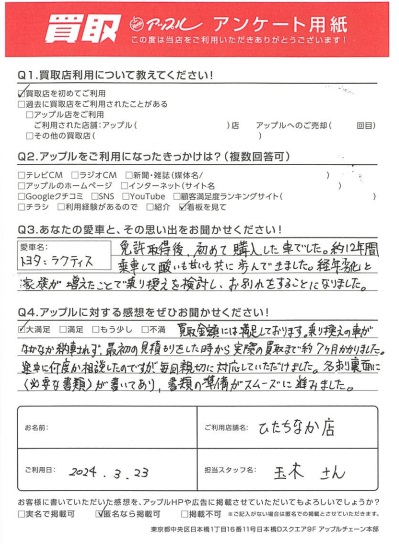 買取金額には満足しております。乗り換えの車がなかなか納車されず、最初の見積もりをした時から実際の買取まで約7ヵ月かかりました。途中に何度か相談したのですが、毎回親切に対応していただけました。名刺裏面に【必要な書類】が書いてあり、書類の準備がスムーズに進みました。