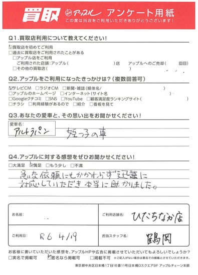 H様 車名:スズキ アルトラパン ラパン(アルト)