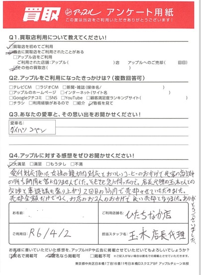 受付対応いただいた女性の親切な対応とおいしいコーヒーのおかげで 先客の商談中の待ち時間も苦になりませんでした。そもそも急に伺ったので。店長代理の玉木さんとの交渉と車談議も盛り上がり2回目の訪問で売却させていただきました。