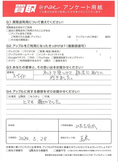 お車のご相談・ 査定だけでもOK! カンタン 入力 30秒 アップルがブランド買取始めました! お電話でも受付中! 受付時間 9:30~18:30 029-352-2311 お車のご相談・ 査定だけでもOK! カンタン 入力 30秒 アップルがブランド買取始めました! お電話でも受付中! 受付時間 9:30~18:30 029-352-2311 アップルがブランド買取始めました! お電話でも受付中! 受付時間 9:30~18:30 029-352-2311 店舗情報 在庫車 スタッフ紹介 ブログ お客様の声 キャンペーン 無料査定 click お客様の声 ご記入日: 2024/03/28 W様 車名:トヨタ スペイド Q:あなたと愛車との思い出をお聞かせください!ネットで見つけて、栃木に取りに行きました。Q:アップルに対する感相をぜひお聞かせください!☆満足☆とても親切でした。 前へ 次へ お客様の声一覧を見る