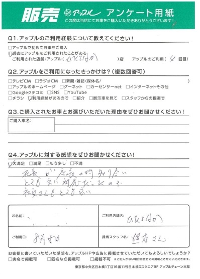 お車のご相談・ 査定だけでもOK! カンタン 入力 30秒 アップルがブランド買取始めました! お電話でも受付中! 受付時間 9:30~18:30 029-352-2311 お車のご相談・ 査定だけでもOK! カンタン 入力 30秒 アップルがブランド買取始めました! お電話でも受付中! 受付時間 9:30~18:30 029-352-2311 アップルがブランド買取始めました! お電話でも受付中! 受付時間 9:30~18:30 029-352-2311 店舗情報 在庫車 スタッフ紹介 ブログ お客様の声 キャンペーン 無料査定 click お客様の声 ご記入日: 2024/08/05 N様 Q:アップルに対する感想をぜひお聞かせください!☆大満足☆社長が店長の時 知り合い、とても良い対応だったので、社員さんもとても良い 前へ 次へ お客様の声一覧を見る