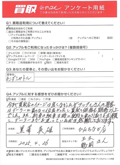 今まで買取店のイメージは良くなかったがアップルさんの接客はディーラーに負けない位良かったし買取り価格も期待以上でした。