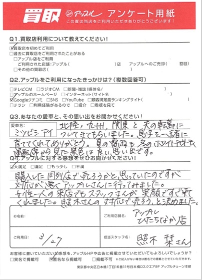 女性一人の来店でもスタッフさんが笑顔ですぐ来てくれました。照木さんの対応で売ろう、と決めました。