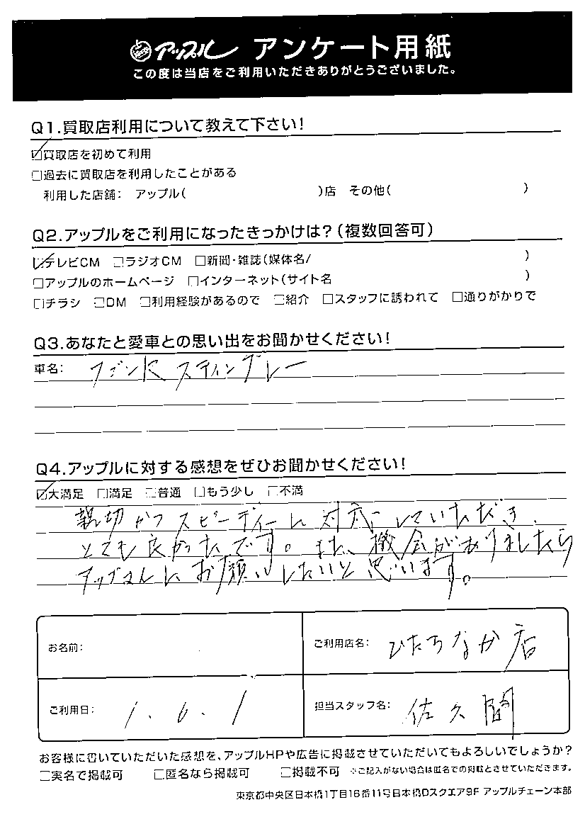 親切かつスピーディーに対応していただき、とても良かったです。また、機会がありましたらアップルさんにお願いしたいと思います。