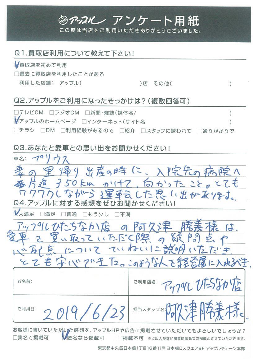 アップルひたちなか店の阿久津 勝義様は、愛車を買い取っていただく際の疑問点や心配点について、ていねいに説明いただきとても安心できた。このような人を経営層に入れるべき!
