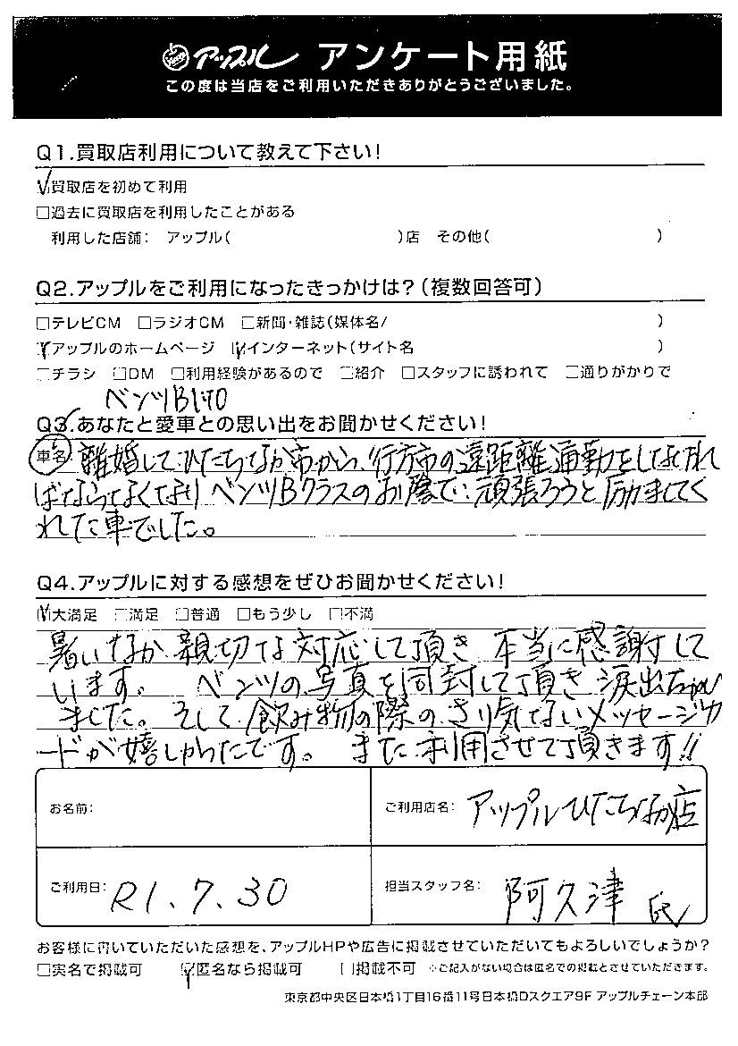 暑いなか親切な対応して頂き、本当に感謝しています。ベンツの写真を同封して頂き涙出ちゃいました。そして、飲み物の際のさり気ないメッセージカードが嬉しかったです。また、利用させて頂きます!!