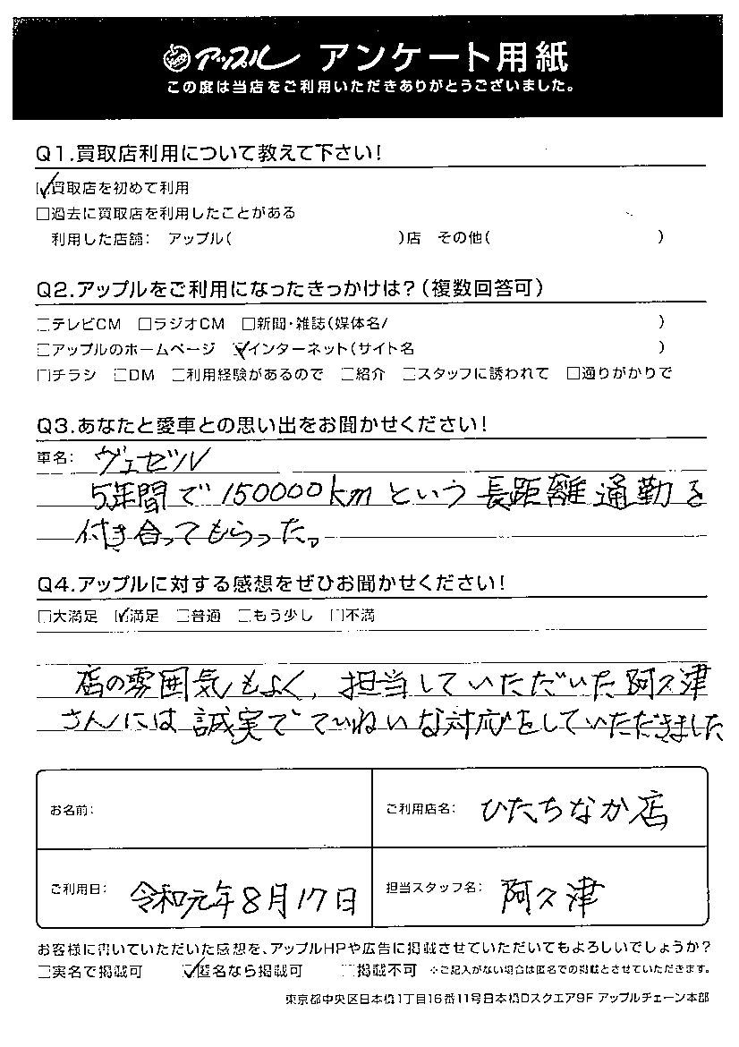 店の雰囲気もよく、担当していただいた阿久津さんには誠実でていねいな対応をしていただきました。
