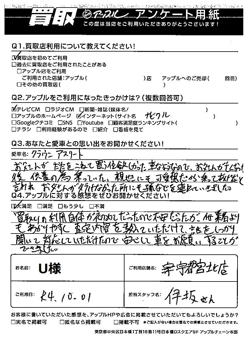 U様 車名:トヨタ クラウンアスリート (H11年9月~H30年6月)