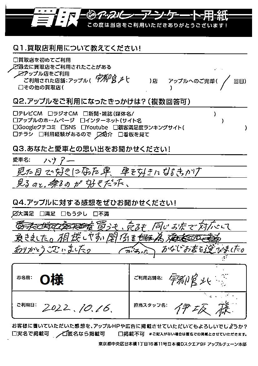 買うも、売るも、同じお店で対応して頂きました。相談しやすい関係があった為、おなじお店を選びました。ありがとうございました。