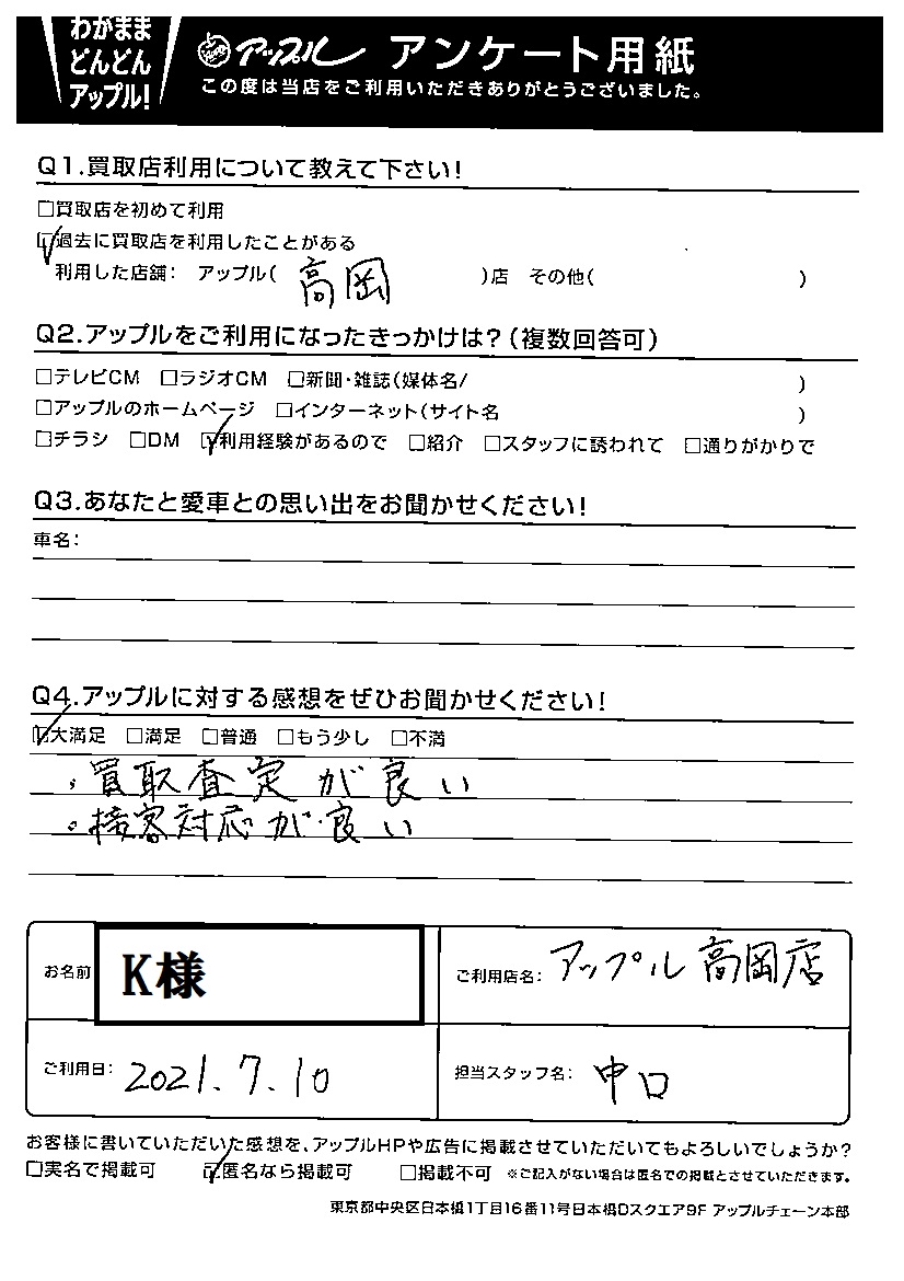 この度は2度目のアップル高岡店ご利用いただきましてありがとうございます。