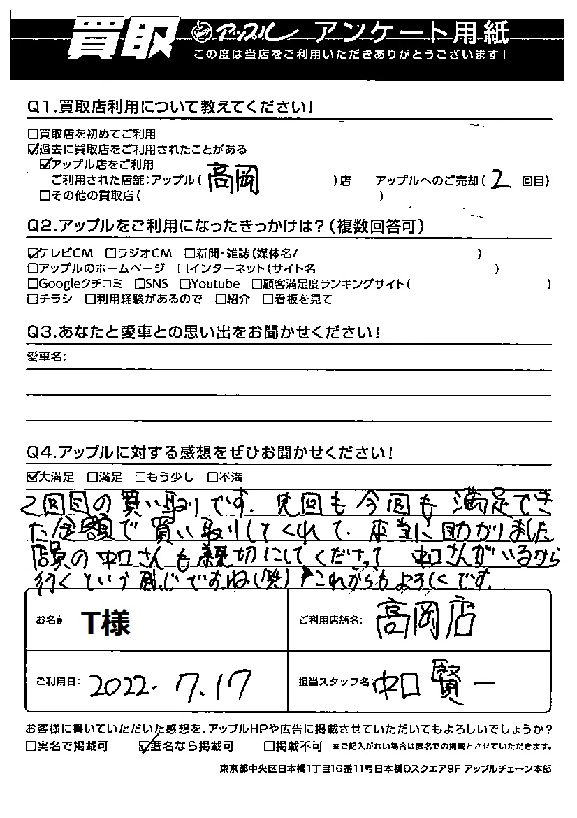A:アップル店高岡店をご利用2回目