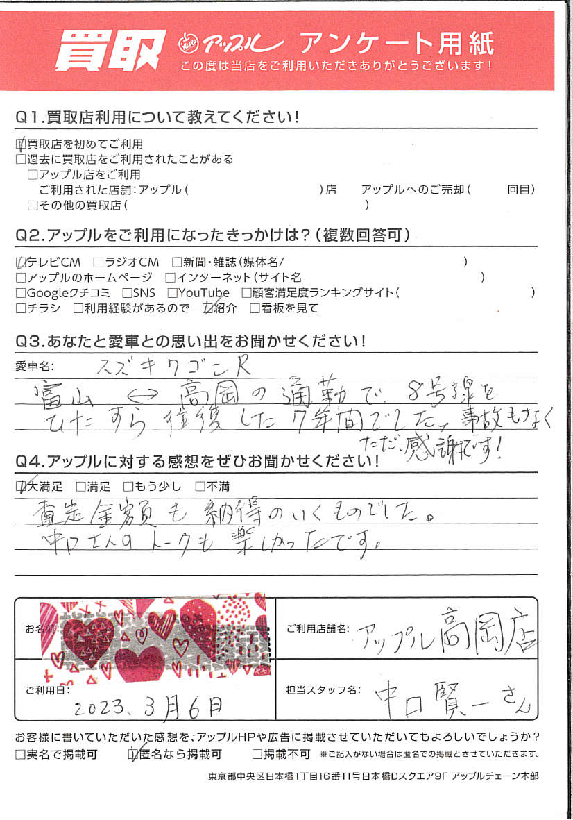 この度はアップル高岡店ご利用いただき誠にありがとうございます。