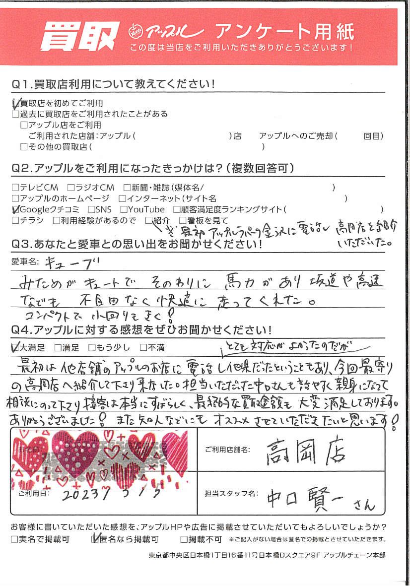担当いただいた中口さんも話やすく親身になって相談にのって下さり接客は本当にすばらしく、
