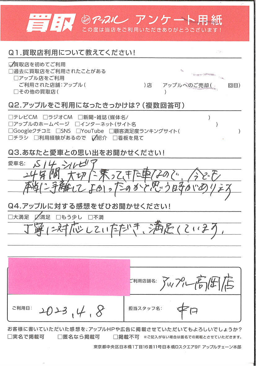 この度はアップル高岡店ご利用いただき誠にありがとうございます。