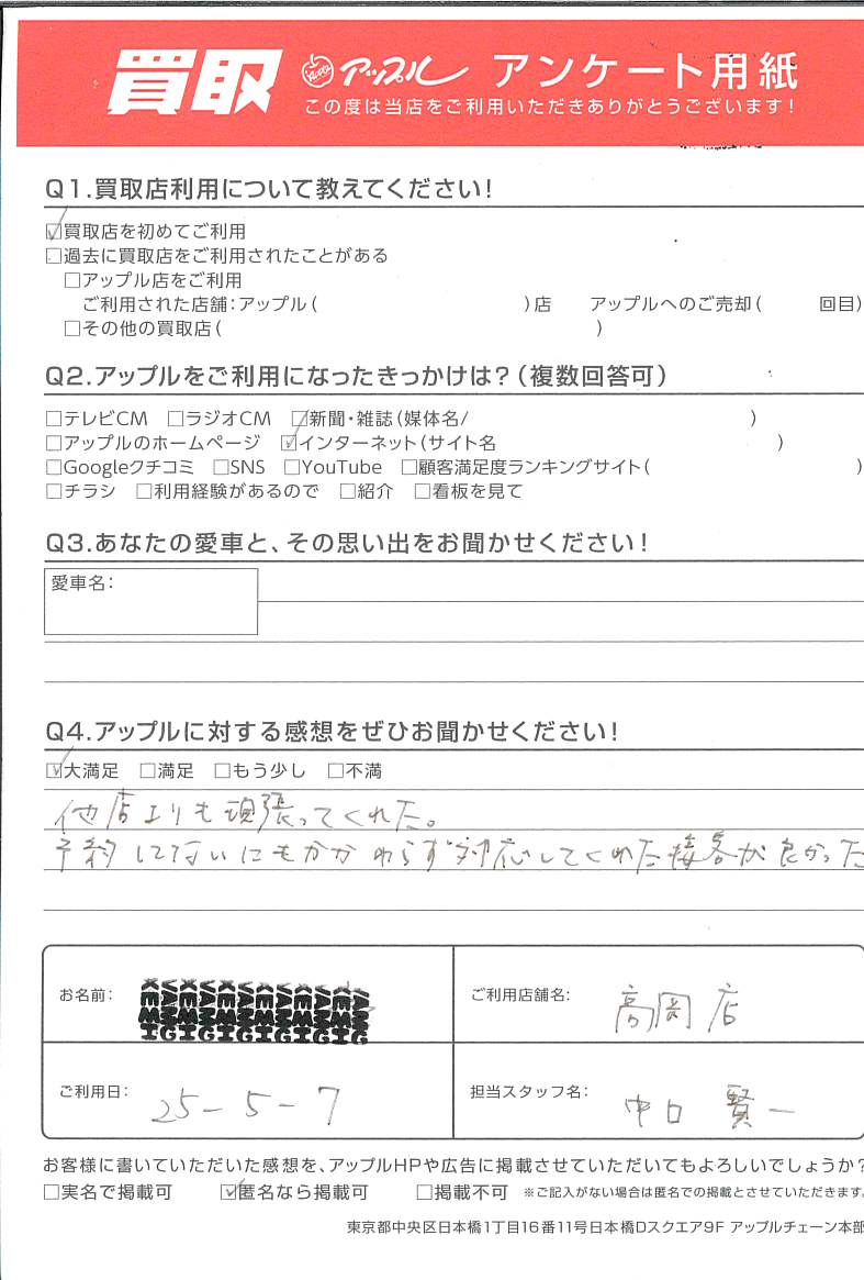 この度はアップル高岡店のご利用ならびにご売却ありがとうございます。