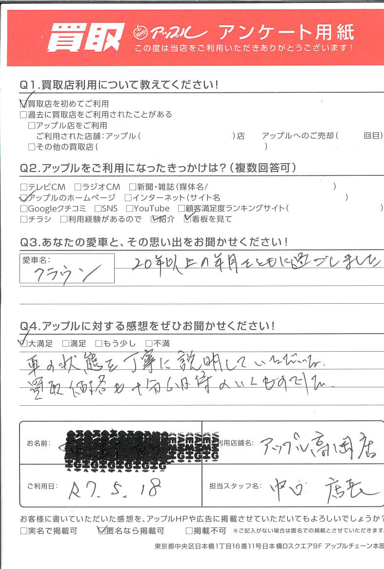 富山県氷見市 S.N様 車名:トヨタ クラウンロイヤル(H11年9月~H30年6月)