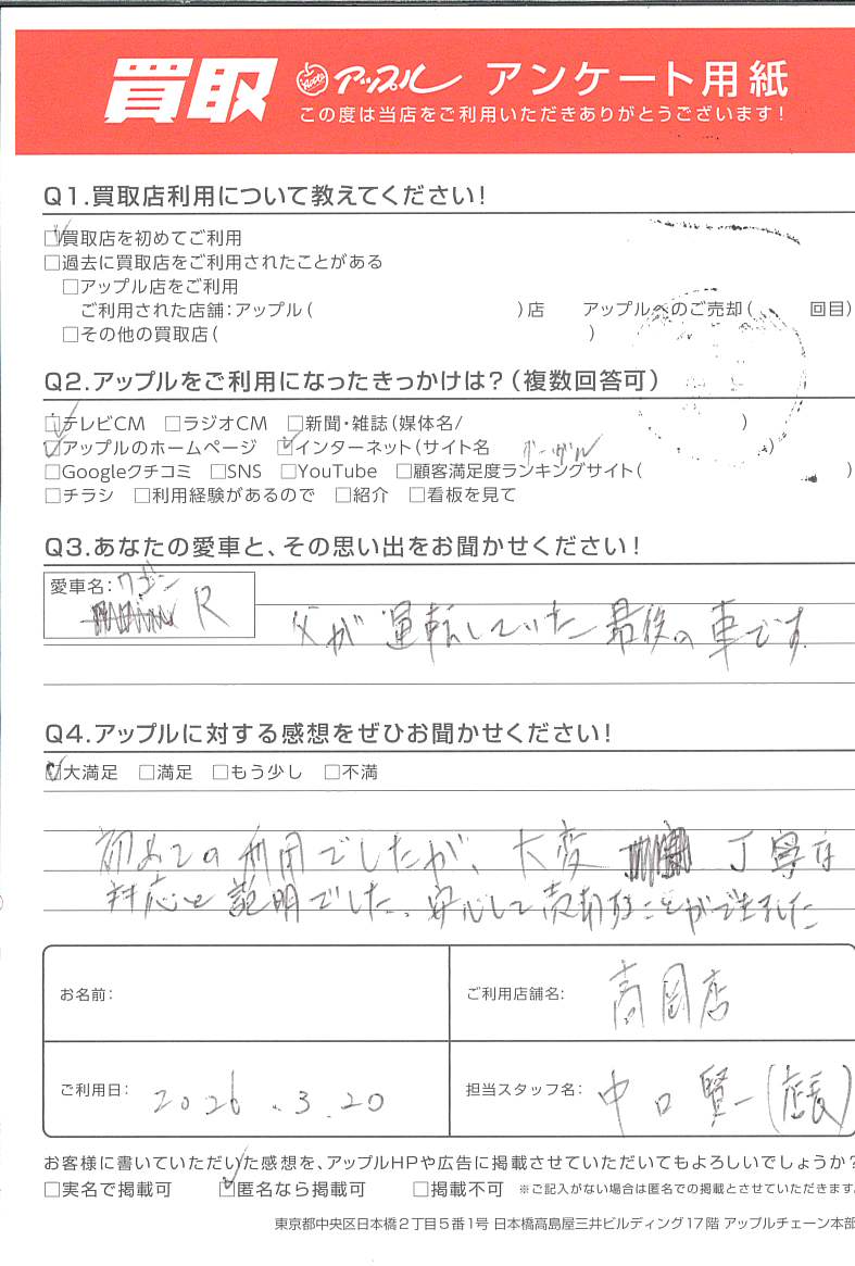 この度はアップル高岡店をご利用いただき、また富山市よりご来店ありがとうございます。またそのお車のご売却重ねましてありがとうございました。嬉しい言葉をいただき恐縮です。また何かございましたらお声を掛けてください。