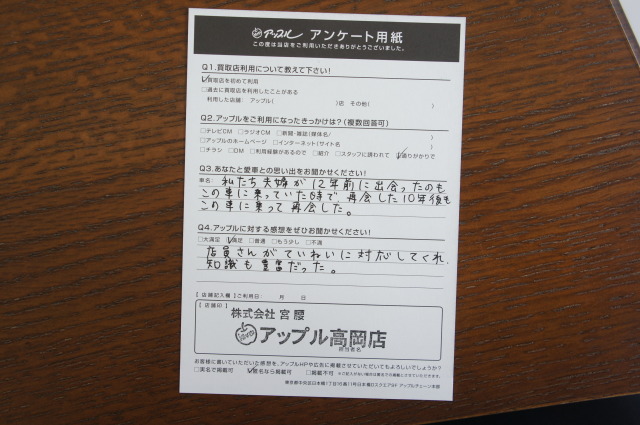 素敵なご夫婦という第一印象。お互いを愛し信頼している雰囲気が漂うお二人でした。他店で強引な契約を迫られ、逃げるように急遽当店にご来店いただいてのご契約となりましたが、私どもは誠心誠意しっかりとした応対を心がけております。また知人等でお車のご売却される方などご紹介いただければ幸いです。今回はありがとうございました。