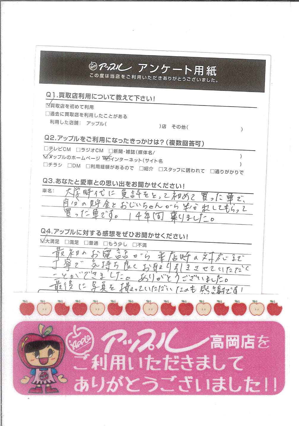 この度は数ある買取店がある中、アップル高岡店ご利用ありがとうございました。新潟より越して来られ、小さなお子様もいらっしゃる中大変だと思いました。閉店間際のご来店でしたが、スムーズに商談させていただき本当にありがとうございました。その後、当店のお客様にご購入いただき、元気に走っていますよ!