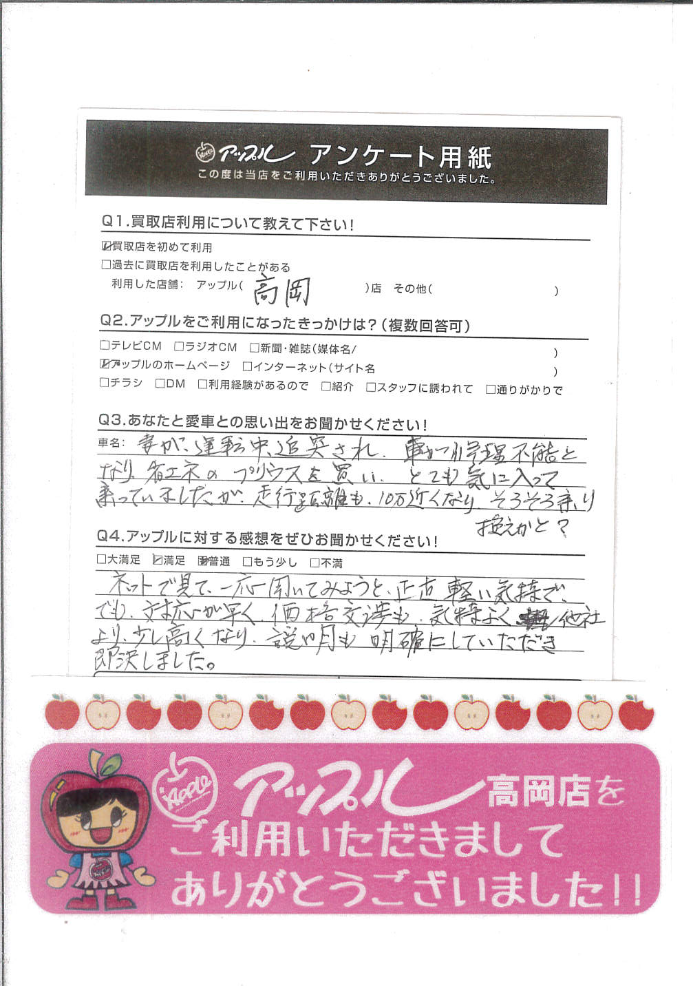 高校の先生でいらっしゃったとの事で、同自動車販売業にもたくさん教え子さんたちがいらっしゃるとの事でしたのに当店の買取金額にご納得頂き即決いただきました。出張査定でお伺いさせていただいた際にも素敵なご夫婦で話が弾み、長居してしまったこと申し訳ございません。また友人知人等で車のご売却があればまたご紹介いただけたらと思います。ありがとうございました。