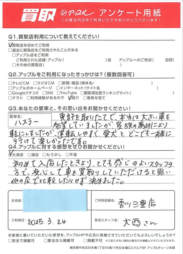 初めて入店したときより、とても感じのよいスタッフの方で、安心して車を買取りしていただけると思い、他の店で比較したりせず決めました。