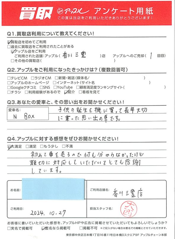 初めて車を売るので何も分からなかったけど、親切に対応していただいて、とても感謝しています。