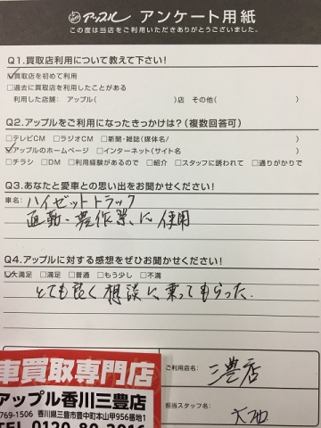 アップルがブランド買取始めました! お電話でも受付中! 受付時間10:00 ~ 18:00 0078-6002-900729 アップルがブランド買取始めました! お電話でも受付中! 受付時間10:00 ~ 18:00 0078-6002-900729 アップルがブランド買取始めました! お電話でも受付中! 受付時間10:00 ~ 18:00 0078-6002-900729 店舗情報 在庫車 スタッフ紹介 ブログ お客様の声 キャンペーン 無料査定 お客様の声 ご記入日: 2018/02/25 K.M様 ◆◆あなたと愛車との思い出を聞かせてください!◆◆車名:ハイゼットトラック通勤・農作業に使用◆◆アップルに対する感想をぜひお書きください!◆◆とても良く相談に乗ってもらった。 前へ 次へ お客様の声一覧を見る