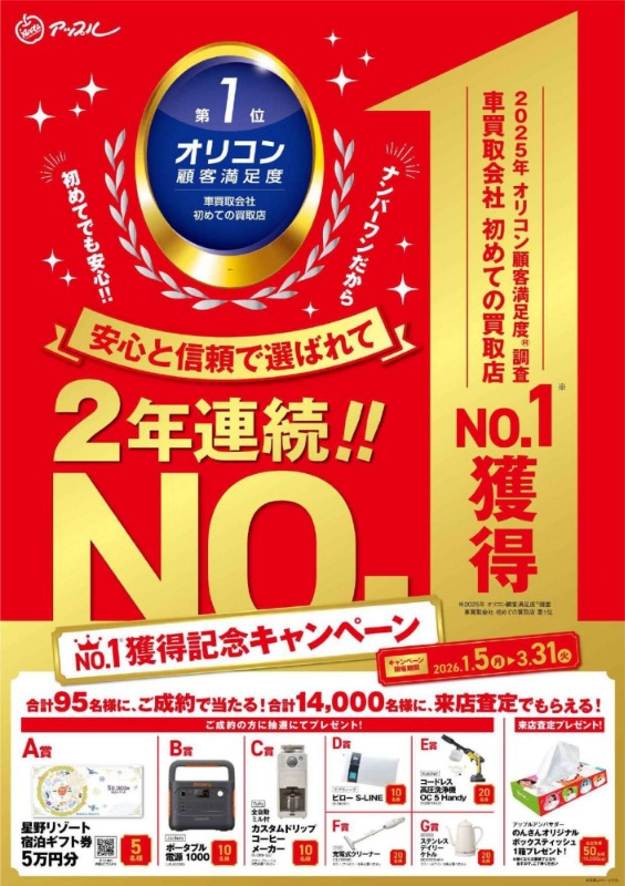 そんな期間に合わせ、アップル全店での統一キャンペーン【2025年 オリコン顧客満足度®調査 車買取会社 初めての買取店 2年連続NO.1獲得記念キャンペーン】