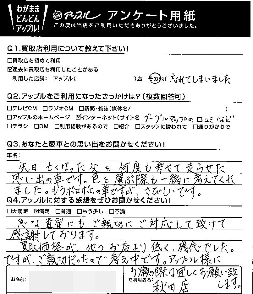 急な査定にもご親切にご対応して頂けて感謝しております。