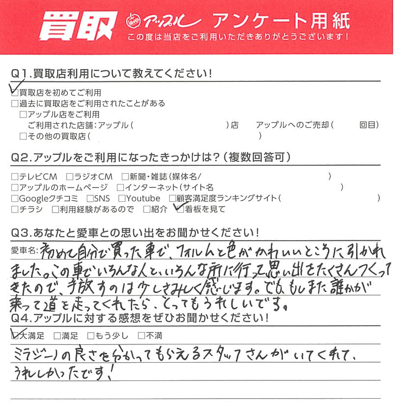 A.ミラジーノの良さを分かってもらえるスタッフさんがいてくれて、うれしかったです!