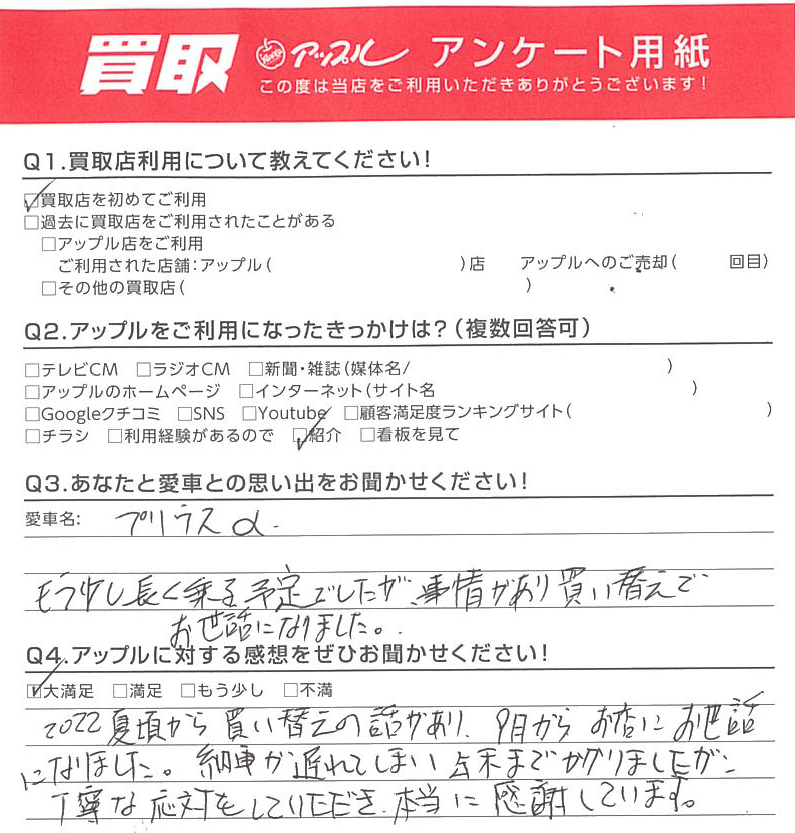 A.もう少し長く乗る予定でしたが、事情があり買い替えでお世話になりました。