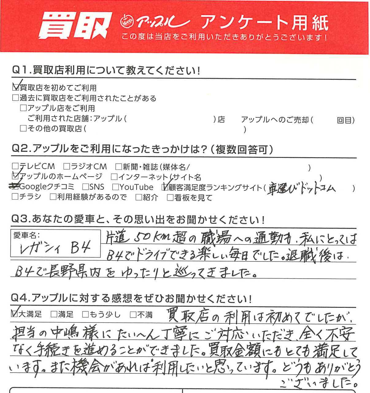 A. 買取店の利用は初めてでしたが、担当の中嶋様にたいへん丁寧にご対応いただき、