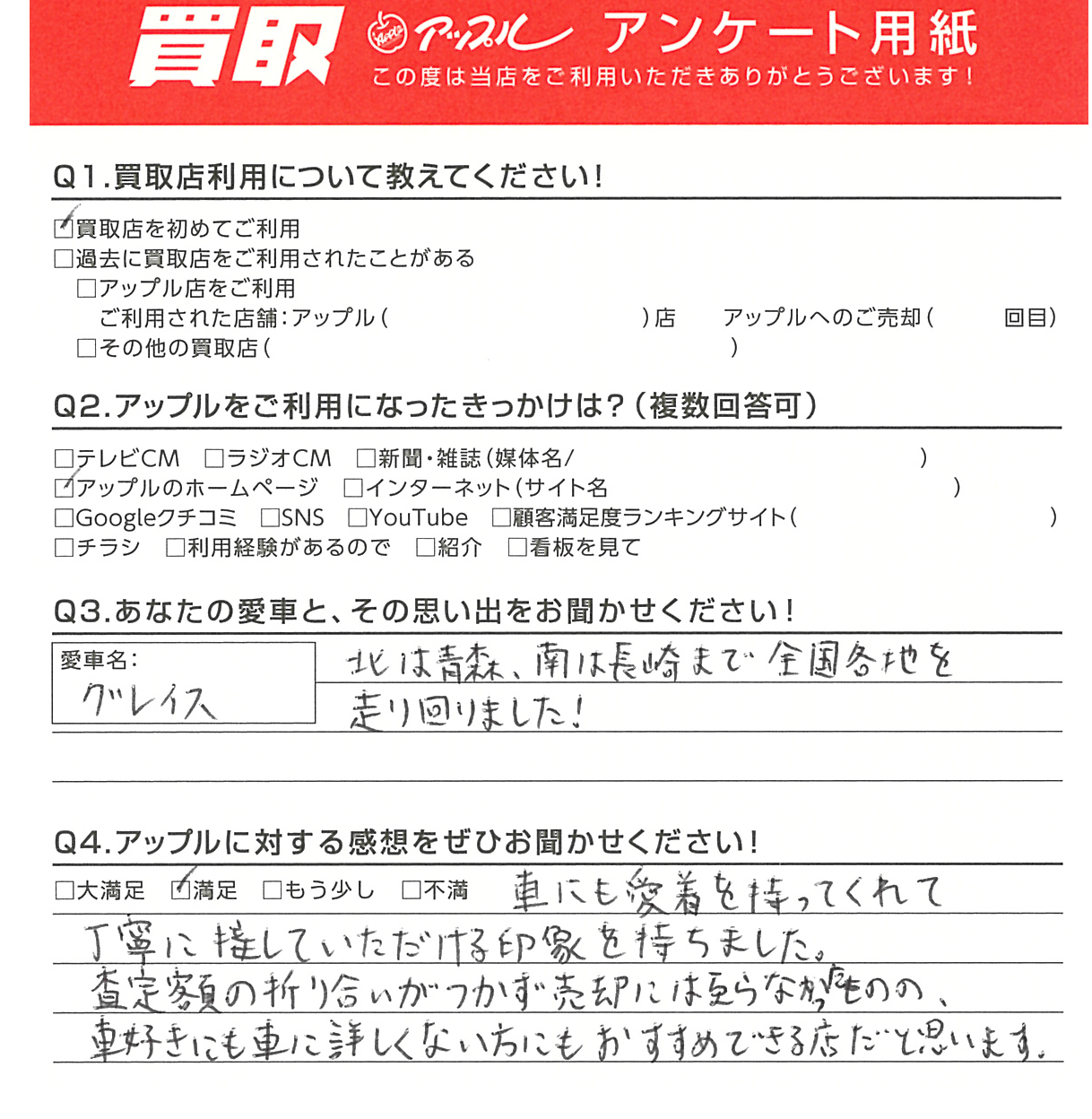 A. 車にも愛着を持ってくれて丁寧に接していただける印象を持ちました。査定額の折り合いがつかず売却には