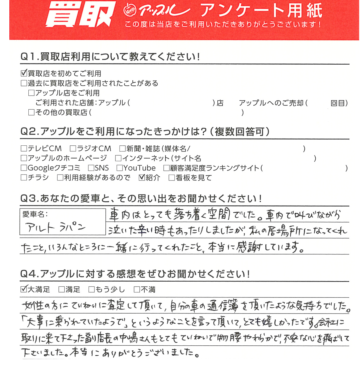 A. 女性の方にていねいに査定して頂いて、自分の車の通信簿を頂いたような気持ちでした。「大事に乗られていたようで」